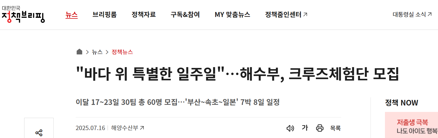 "바다 위 특별한 일주일"…해수부, 크루즈체험단 모집 해수부 보도자료 보러가기