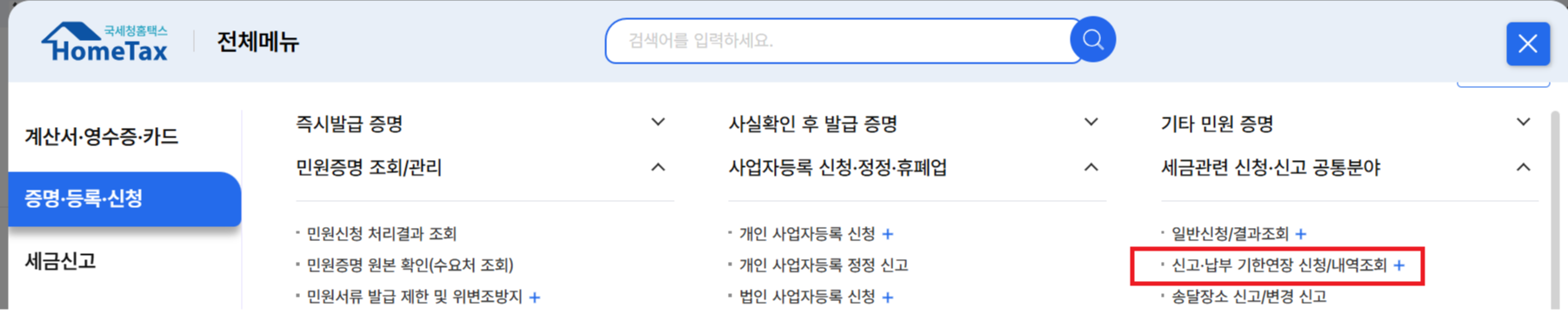 홈택스 접속 → [신청/제출] → [기한연장신청] 클릭